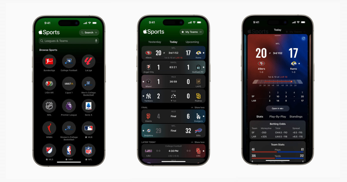 Από την κυκλοφορία της τον Φεβρουάριο, η εφαρμογή Apple Sports έχει δώσει έναν εξορθολογισμένο τρόπο για τους οπαδούς να παραμείνουν ενημερωμένοι για βαθμολογίες και στατιστικά στοιχεία σε διάφορα πρωταθλήματα, όπως το NFL, το NCAA Football, το MLS, το MLB, το NBA και πολλά άλλα. Με αυτά τα νέα χαρακτηριστικά, η Apple στοχεύει να ανταγωνιστεί πιο άμεσα με τις καθιερωμένες αθλητικές εφαρμογές όπως το ESPN και το Fox Sports, προσφέροντας μια πιο ολοκληρωμένη και εντυπωσιακή εμπειρία για τους λάτρεις των αθλητικών.