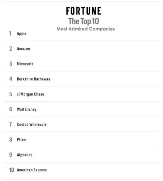 Η Apple κατάφερε να κρατήσει την πρώτη θέση στις πιο θαυμασμένες εταιρείες του Forbes-Compared Worldλίσταγια δεκαπέντε χρόνια τώρα. Αυτό το έτος δεν είναι διαφορετικό, η Apple κατόρθωσε να ξεπεράσει μια σειρά σημαντικών επιχειρήσεων, συμπεριλαμβανομένου του Berkshire Hathaway στην τέταρτη, Amazon και Microsoft δεμένα για δεύτερη, και Berkshire Hathaway στο τρίτο.