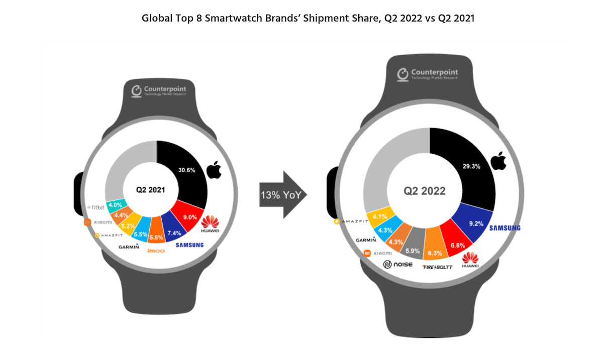 Μια νέα έρευνα από την Counterpoint Research αποκαλύπτει ότι η παγκόσμια αγορά smartwatch αυξήθηκε κατά 13% σε ετήσια βάση στο Q2, το 2022 και η Apple Watch κυριάρχησε στο τμήμα καταγράφοντας το μεγαλύτερο μερίδιο αγοράς.