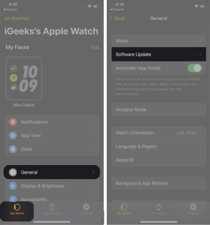 Εάν δεν έχετε ενημερώσει το ρολόι της Apple για μεγάλο χρονικό διάστημα, η ενημέρωση στην τελευταία έκδοση WatchOS ενδέχεται να σας βοηθήσει να διορθώσετε το πρόβλημα. Δείτε πώς μπορείτε να χρησιμοποιήσετε το iPhone σας για να ενημερώσετε το ρολόι σας: Μεταβείτε στοΠαρακολούθηση εφαρμογήςστο iPhone →Γενικός→Ενημέρωση λογισμικού→Λήψη και εγκατάσταση.