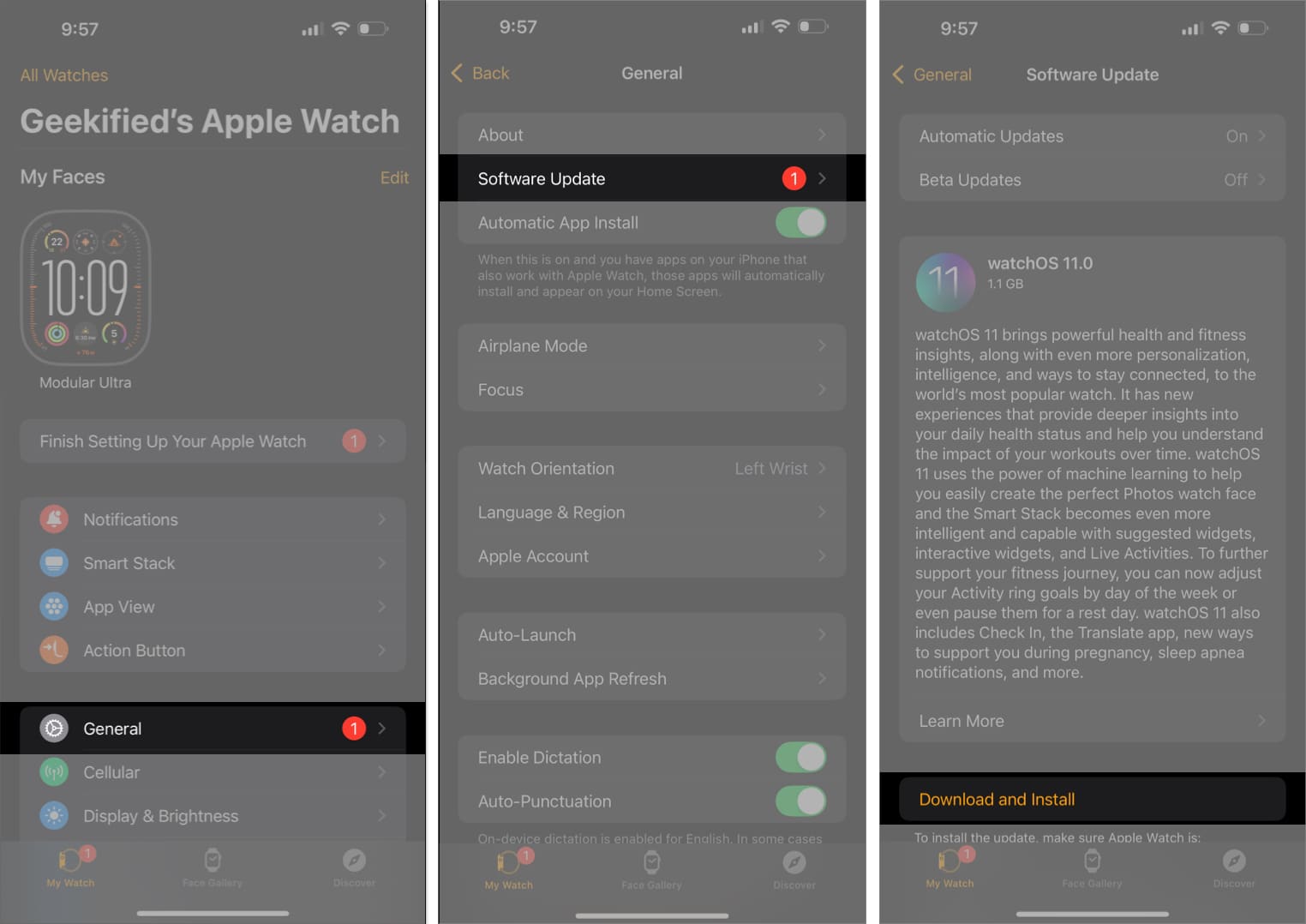 Εναλλακτικά, μπορείτε επίσης να χρησιμοποιήσετε το iPhone σας για να ενημερώσετε το Apple Watch. Ανοίγω τοΡολόιεφαρμογή στο iPhone σας και από τοΤο ρολόι μουκαρτέλα, μεταβείτε στοΓενικός>Ενημέρωση λογισμικού. Κατεβάστε και εγκαταστήστε τυχόν ενημερώσεις που έχετε εκκρεμεί.