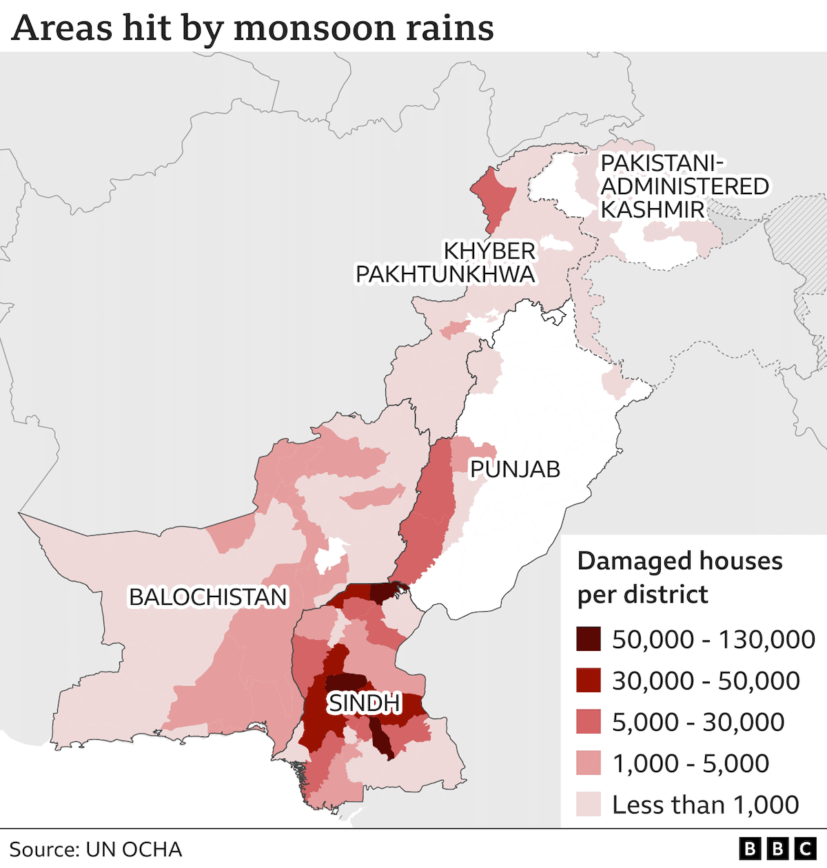 Η παγκόσμια μετεωρολογική οργάνωση του ΟΗΕ δήλωσε ότι το Πακιστάν και η Βορειοδυτική Ινδία είχαν μια έντονη εποχή των μουσώνων φέτος-με έναν ιστότοπο στη Sindh να αναφέρει 1.288 χιλιοστά βροχής μέχρι στιγμής τον Αύγουστο, σε σύγκριση με το μηνιαίο μέσο όρο των 46 χιλιοστών.