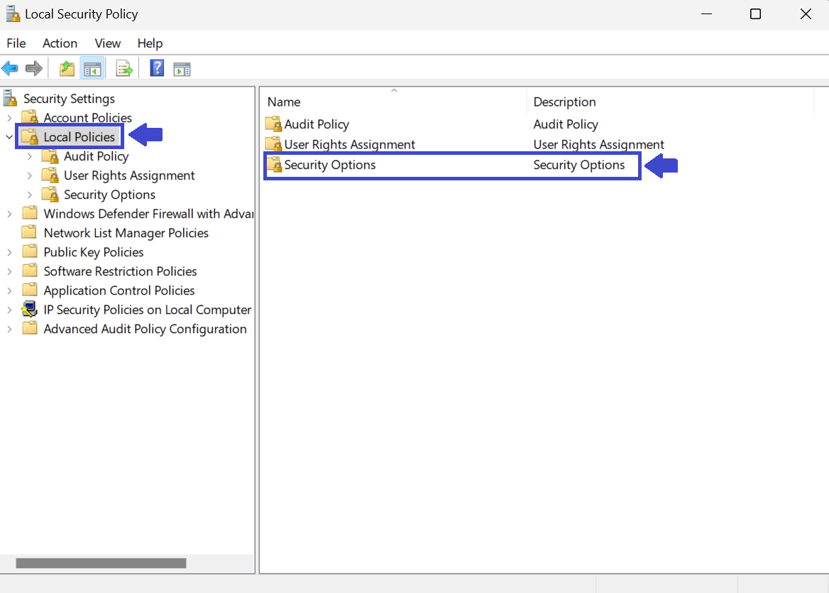 2. Πηγαίνετε στις τοπικές πολιτικές και επιλέξτε επιλογές ασφαλείας.