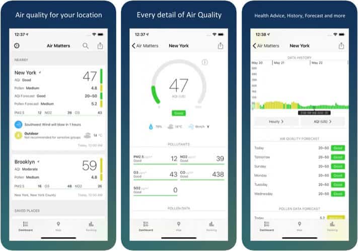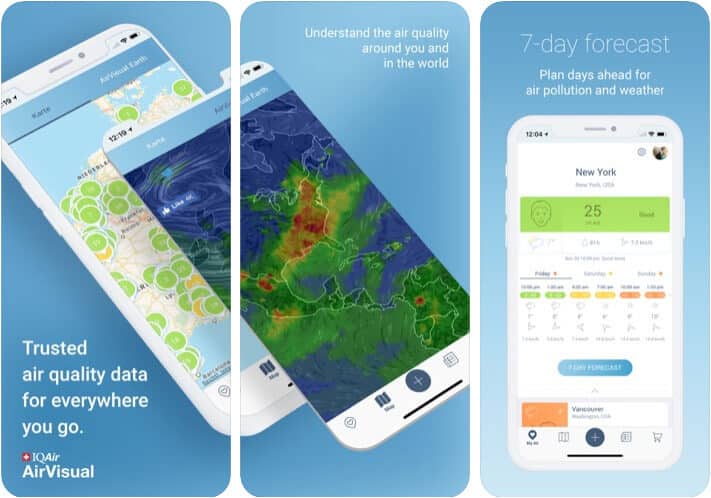 Με μια καθαρή διεπαφή και διαφορετικούς συνδυασμούς χρωμάτων που υποδεικνύουν διάφορα επίπεδα δείκτη ποιότητας αέρα, οι αεροπορικές τάξεις στην κορυφή του App Store για να ελέγξουν το AQI. Δείχνει τα δεδομένα πραγματικού χρόνου πάνω από 10.000 τοποθεσίες που καλύπτουν 100 χώρες. Έτσι, ανεξάρτητα από το πού ταξιδεύετε, μπορείτε πάντα να λάβετε μια γρήγορη βοήθεια από αυτήν την εφαρμογή στο iPhone ή το iPad σας σχετικά με τον καιρό και το AQI.