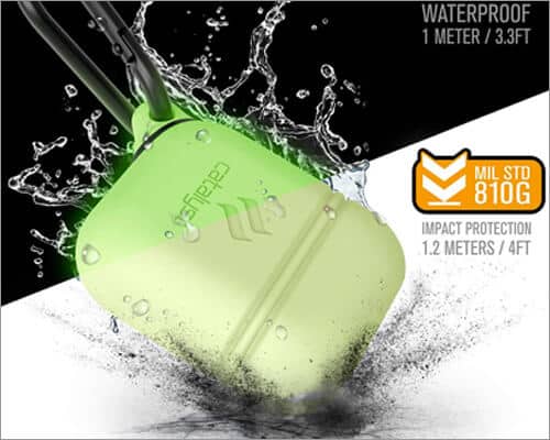 Ενώ οι περισσότεροι από εμάς προτιμούν τους καραμπίνερ να συνδέσουν τα airpods μας σε τσάντες ή παντελόνια ή άλλους βρόχους, μερικοί από εμάς θέλουμε να το κρατήσουμε ελάχιστο με ένα κορδόνι. Ως αποτέλεσμα, αυτή η περίπτωση έρχεται με ένα ιμάντα καρπού αντί για ένα τυπικό καραμπίνερ. Παρόλο που ζυγίζει μόνο μισές ουγγιές, αυτή η περίπτωση είναι πλήρως ικανή να προστατεύσει τα ακουστικά Bluetooth.