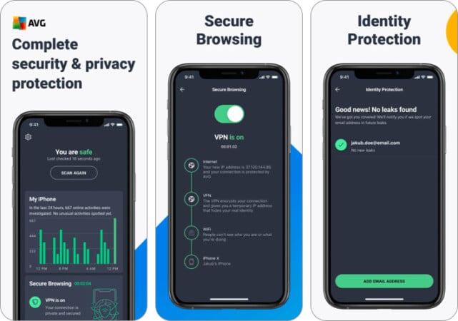 Το TotalAV χρησιμοποιεί υπηρεσίες φιλτραρίσματος ιστότοπων και υπηρεσίες VPN για την προστασία του iPhone σας από την ιογενή μόλυνση στο διαδίκτυο. Προσφέρει επίσης υπηρεσίες Web Shield, VPN, Antifraud και Antitheft ως προστιθέμενα χαρακτηριστικά. Υπάρχει επίσης ένας δημοσιογράφος διαρροής δεδομένων για να σαρώσετε το Διαδίκτυο για να ανιχνεύσετε το email σας σε παραβιάσεις δεδομένων.