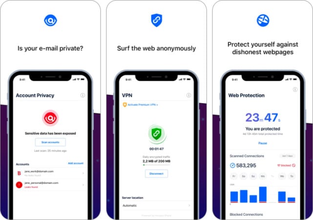 Όπως πολλές άλλες εφαρμογές προστασίας από ιούς, η εφαρμογή διαθέτει υπηρεσίες VPN για να καλύψει την ηλεκτρονική σας παρουσία. Υπάρχει επίσης ένα πρόγραμμα απορρήτου λογαριασμού για τη σάρωση του αναγνωριστικού email σας για τη συμμετοχή του σε οποιαδήποτε παραβίαση της ασφάλειας. Έτσι, αυτό σας λέει πού διαρρέουν τα δεδομένα σας και συνιστά τον τρόπο προστασίας του.