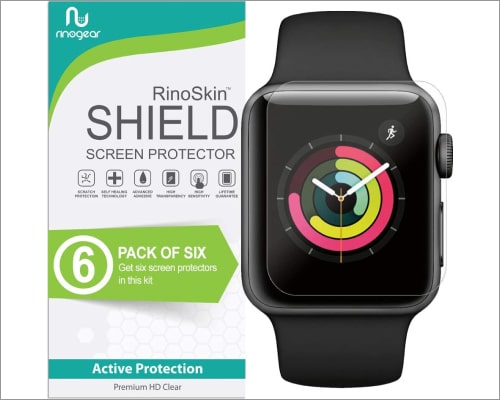 Ακολουθεί ένας άλλος υποψήφιος για τον κατάλογο των προστατευτικών οθόνης της Apple Watch. Ο προστάτης οθόνης Rinogear κατασκευάζεται από ένα πολυεπίπεδο υλικό έξυπνου δέρματος που τηρεί τη συσκευή με έξυπνο πολυμερές συγκολλητικό. Ως εκ τούτου, το μετρημένο είναι εξαιρετικά προσαρμόσιμο και μπορεί εύκολα να ταιριάζει στα περιγράμματα του Apple Watch σας.