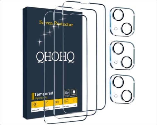 Το QHOHQ προσφέρει προστάτη 2 σε ένα. Έρχεται και με τον προστατευτικό οθόνης και τον προστάτη της οθόνης του iPhone 13. Έχει σκληρότητα 9h, 2,5d στρογγυλεμένες γωνίες, γυαλί 0,33 mm και μια ομαλή άκρη χωρίς ακρίβεια. Στη συνέχεια, η νυχτερινή επικάλυψη αντι-γυαλί θα προστατεύσει τη συσκευή σας από το νερό, το λάδι, τη σκόνη, τα δακτυλικά αποτυπώματα και τις γρατζουνιές.