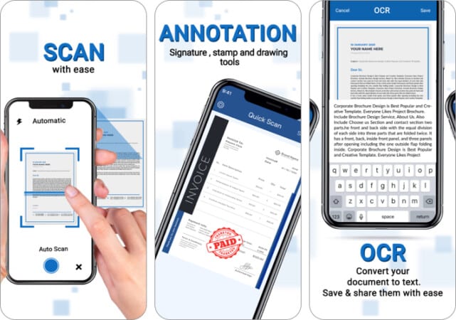 Ένα από τα πιο σημαντικά χαρακτηριστικά αυτής της εφαρμογής είναι η δυνατότητα να σαρώσετε την υπογραφή σας. Έτσι, χρησιμοποιήστε την κάμερα στο iPhone σας για να σαρώσετε οτιδήποτε με υπογραφή, συμπεριλαμβανομένων βιβλίων, χαρτιού, τιμολογίων και συμβάσεων. Επιπλέον, οι σαρώσεις μπορούν να αποθηκευτούν ως αρχεία PDF ή JPG.