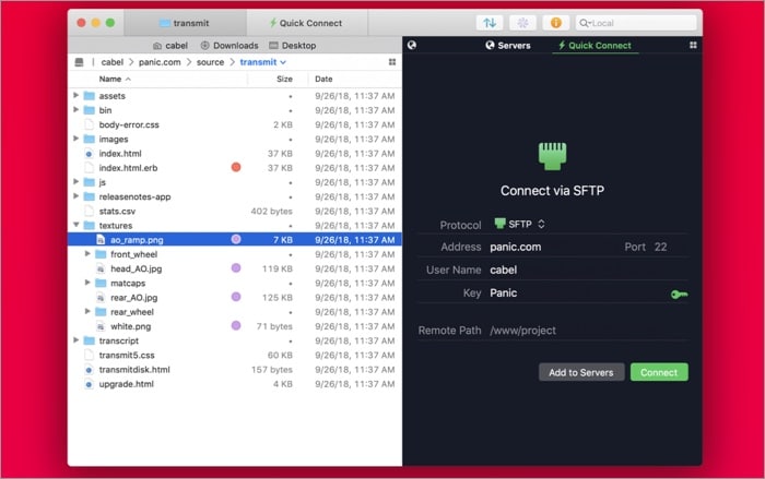 Το Transmit 5 διαθέτει το καλύτερο περιβάλλον χρήστη μεταξύ όλων των πελατών FTP σε Mac. Με ένα μόνο κλικ, μπορείτε γρήγορα να συνδεθείτε σε πολλαπλές υπηρεσίες αποθήκευσης cloud, όπως το πλαίσιο, το Google Drive, το Amazon Drive κ.λπ. και να ξεκινήσετε τη μεταφόρτωση αρχείων στο διακομιστή.