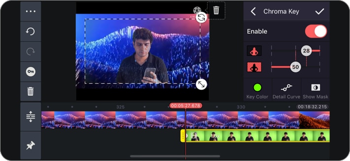 Μπορείτε να επιλέξετε ένα κατάλληλο χρώμα κλειδιού, να διαχειριστείτε την ένταση, να δείτε τη μάσκα και να επεξεργαστείτε την καμπύλη. Παίρνετε πολλές επιλογές ανάμειξης, ανάμειξης και κινούμενων εικόνων παράλληλα με εικόνες αποθεμάτων, αυτοκόλλητα, ειδικά εφέ, κείμενο κ.λπ.