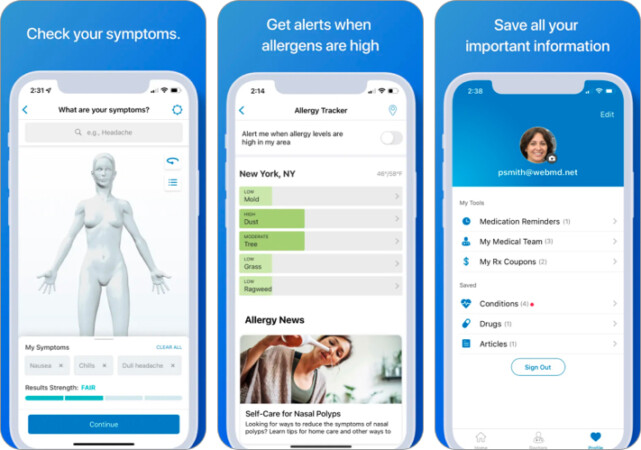 Το WebMD βοηθά με πολλά θέματα που σχετίζονται με την υγεία, αλλά ο ελεγκτής των συμπτωμάτων είναι κορυφαία. Ωστόσο, ενώ πολλές hypes περιβάλλουν την εφαρμογή, δεν αποτελεί υποκατάστατο της ιατρικής παρέμβασης. Η εφαρμογή διαθέτει επίσης υπενθύμιση για την πρόσληψη φαρμάκων εάν συχνά ξεχάσετε να πάρετε τα φάρμακά σας.