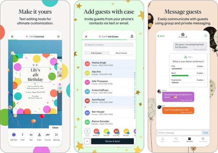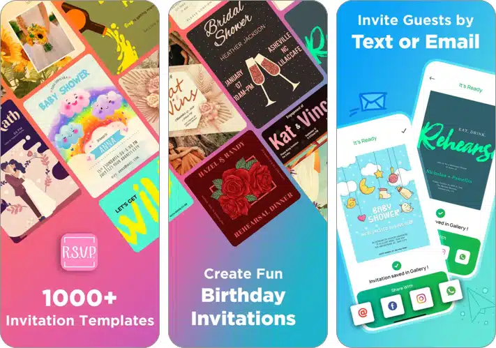Αυτή η εφαρμογή κατασκευαστή καρτών σας επιτρέπει επίσης να στείλετε προσκλήσεις μέσω πολλαπλών μέσων όπως τα μηνύματα ηλεκτρονικού ταχυδρομείου, το κείμενο και πολλά άλλα. Επιπλέον, καθιστά εξαιρετικά εύκολο να παρακολουθήσετε προσεκτικά τα RSVPs και να τα διαχειριστείτε χωρίς καμία ταλαιπωρία.
