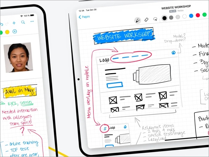 Χρησιμοποιώντας το μολύβι της Apple, το Nebo προσφέρει επίσης πολλά ψηφιακά εργαλεία στυλό για την κατάρτιση διαφόρων σχημάτων, μαθηματικών εξισώσεων και doodles. Επίσης, μπορείτε να σχολιάσετε εξωτερικό υλικό και να εισαγάγετε διαγράμματα και φωτογραφίες. Υποστηρίζει σημειώσεις εξαγωγής σε συμβατές με PowerPoint HTML, PDF και μορφές κειμένου και συγχρονίζεται με το iCloud ή το Dropbox.