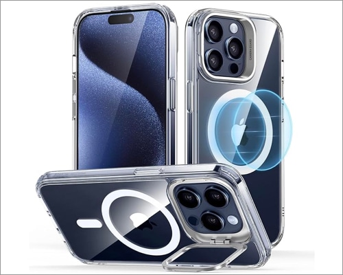 Ένα από τα κύρια σημεία αυτού του εξώφυλλου iPhone 15 Pro είναι το περίπτερο πολλαπλών χρήσεων τοποθετημένο γύρω από την πίσω κάμερα. Αυτό το μικροσκοπικό περίπτερο γίνεται με κράμα ψευδαργύρου που του δίνει δύναμη και ανθεκτικότητα. Μπορείτε να χρησιμοποιήσετε τη βάση για να απολαύσετε την προβολή hands-free στο smartphone σας. Είναι πλήρως ρυθμιζόμενο και παρέχει μια σταθερή άποψη ακόμη και όταν κινείστε.