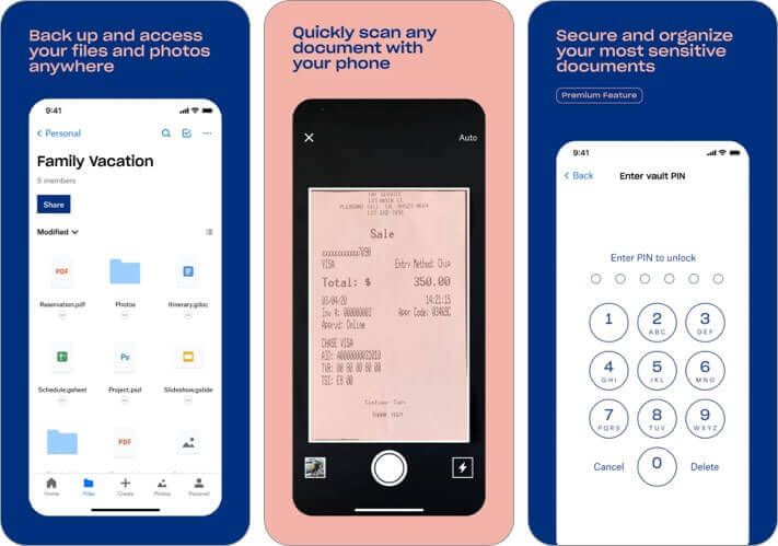 Το Dropbox σας δίνει με τον ευκολότερο τρόπο να κρατάτε τα αρχεία σας εύχρηστα, μεταφορτώντας τα στο σύννεφο. Εκτός από την αποθήκευση, μπορείτε επίσης να τα μοιραστείτε με τους συναδέλφους, τους συνεργάτες και τους πελάτες σας. Η εφαρμογή σάς επιτρέπει να μοιράζεστε μεγάλα αρχεία, να σαρώσετε έγγραφα, αναγνωριστικά, αποδείξεις, φωτογραφίες και πολλά άλλα. Εκτός αυτού, με το Dropbox, μπορείτε να έχετε πρόσβαση σε οποιαδήποτε μορφή αρχείου ακόμη και όταν είστε εκτός σύνδεσης. Υποστηρίζει πάνω από 175 διαφορετικούς τύπους αρχείων χωρίς ανάγκη για πρόσθετο λογισμικό. Πολύ εύχρηστο, σωστά;
