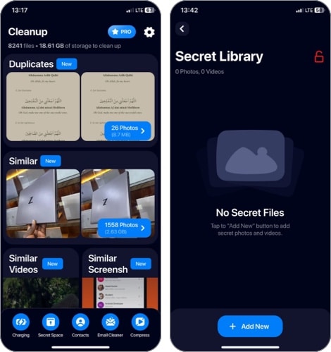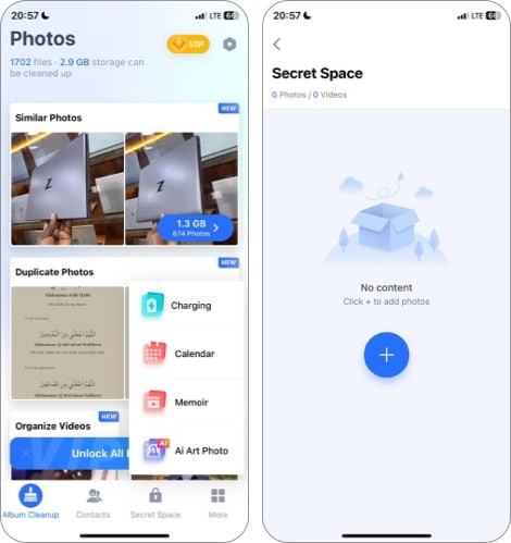 Η εφαρμογή Cleaner - Free Up Storage περιλαμβάνει επίσης ένα μυστικό χώρο για την απόκρυψη φωτογραφιών και βίντεο, μαζί με ένα εργαλείο για τη συμπίεση μεγάλων αρχείων πολυμέσων, απελευθερώνοντας χώρο αποθήκευσης στο iPhone σας.