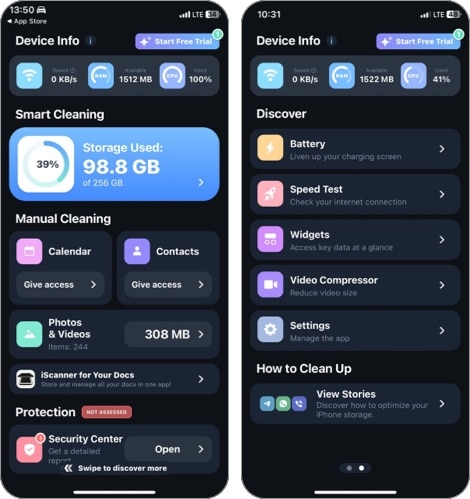 Καθαρίστε το κιτ καθαρισμού αποθήκευσης -καθαρισμού είναι μια ισχυρή εφαρμογή καθαρισμού iPhone που μπορεί να σας βοηθήσει να διαχειριστείτε και να οργανώσετε τα αρχεία πολυμέσων στη συσκευή σας αποτελεσματικά. Όταν ξεκινάτε την εφαρμογή, όλα τα χαρακτηριστικά καθαρισμού είναι άμεσα προσβάσιμα. Αυτά περιλαμβάνουν έξυπνο καθαρισμό, χειροκίνητο καθαρισμό (για φωτογραφίες/βίντεο, επαφές και ημερολόγιο) και μια επιλογή πληροφοριών συσκευής που εμφανίζει την ταχύτητα λήψης, τη χρήση της CPU και τη χρήση RAM.