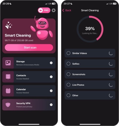Η λειτουργία Smart Cleaning σαρώνει αυτόματα τη συσκευή σας για στιγμιότυπα οθόνης, παρόμοιες φωτογραφίες, παρόμοια βίντεο και αντίγραφα, επιτρέποντάς σας να τις αφαιρέσετε και να απελευθερώσετε αποθήκευση. Πριν προχωρήσετε με την εκκαθάριση, η εφαρμογή σάς επιτρέπει να ελέγξετε τα επιλεγμένα αρχεία, ώστε να μπορείτε να επιλέξετε ποιες από αυτές πρέπει να κρατήσετε.