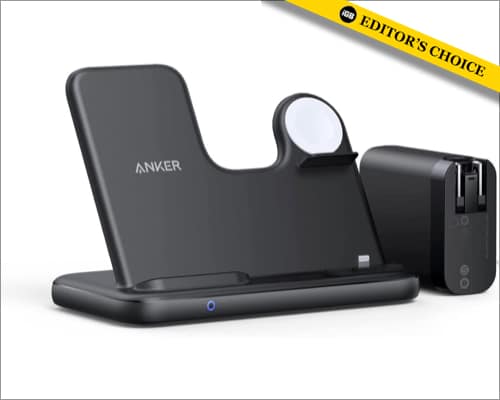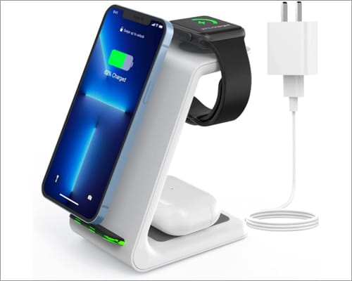 Ένας άλλος εκπληκτικός σταθμός ασύρματης σύνδεσης 3 σε 1 για να χυμό το iPhone, το Apple Watch και το AirPods. Αλλά χρειάζεστε έναν μετατροπέα 12V/2A ή 9V/2.7A για να φορτίσετε το τηλέφωνο, ακουστικά και να παρακολουθήσετε ταυτόχρονα. Επίσης, έχει μόνο τη διασύνδεση USB-A για το καλώδιο ρολογιών.