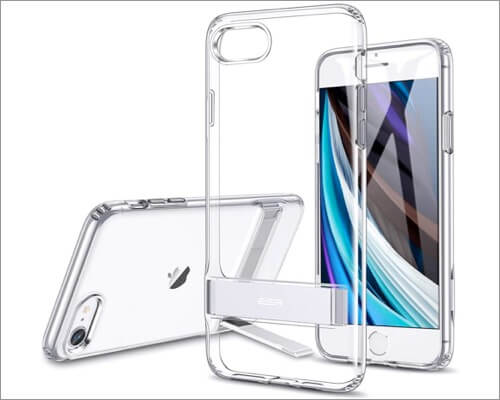 Το ESR σας επιτρέπει να χρησιμοποιήσετε το τηλέφωνό σας στο δρόμο σας. Και για το σκοπό αυτό, το εμπορικό σήμα εγκαθιστά ένα kickstand σε μια ασύρματη υπόθεση που υποστηρίζεται από το iPhone SE 2. Αυτό είναι ένα από τα σπάνια επιτεύγματα που επιτεύχθηκαν από την ESR.