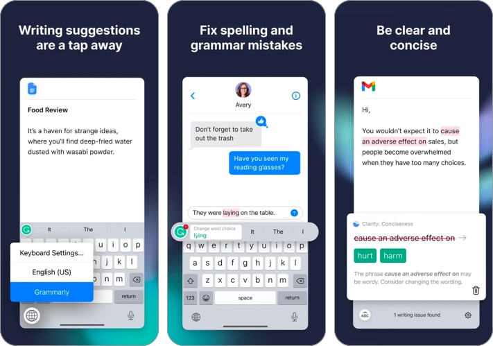 Εκτός από την παροχή προτάσεων ορθογραφίας, γραμματικής και συνοπτικής, έχει ανίχνευση τόνου, κείμενο και emoji προβλέψεις, έξυπνη αυτόματη διόρθωση και πολλά άλλα. Η εφαρμογή του διαθέτει έναν πλήρη επεξεργαστή εγγράφων με τα ίδια χαρακτηριστικά με το Grammarly Web, συμπεριλαμβανομένων των στατιστικών εγγράφων, της διαχείρισης εγγράφων που βασίζεται σε σύννεφο, της ολοκληρωμένης ανατροφοδότησης γραφής και άλλων.