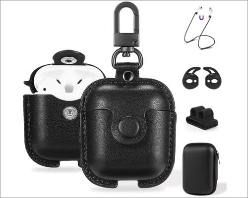 Εδώ είναι μια άλλη χαριτωμένη δερμάτινη θήκη που ταιριάζει απόλυτα με τα AirPods σας. Έχει επίσης ένα ιμάντα keychain που μπορεί να είναι χρήσιμο αν είστε ποδηλάτης. Επιπλέον, αντιστέκεται στη σκόνη και τη βρωμιά για να φτάσετε στα airpod σας.