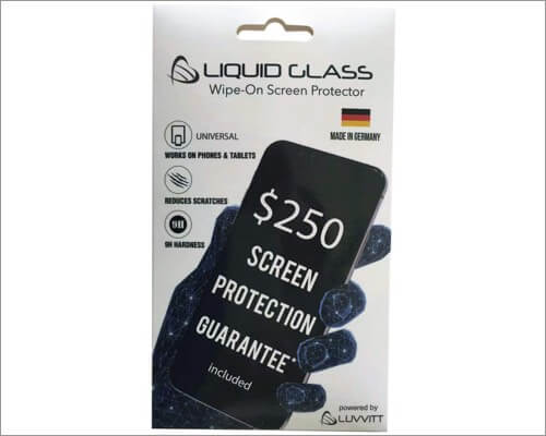 Είναι κατασκευασμένο στη Γερμανία και δημιουργεί μια αόρατη προστατευτική επίστρωση που αυξάνει τη δύναμη της οθόνης σας σε σκληρότητα 9H. Επιπλέον, εάν η συσκευή σας είναι κατεστραμμένη, ενώ προστατεύεται από αυτό το υγρό γυαλί, μια περιορισμένη εγγύηση αντικατάστασης παρέχει έως και 250 ασφάλιση κάλυψης $ 250 προς επισκευή οθόνης.