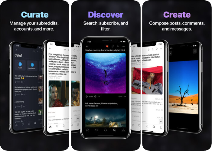 Η εφαρμογή διαθέτει πολλά μοναδικά χαρακτηριστικά όπως η υποστήριξη για πολλαπλούς λογαριασμούς Reddit, την προστασία του κωδικού πρόσβασης, τη λειτουργία νυχτερινής λειτουργίας, τη λειτουργία αναγνώστη για εντυπωσιακή ανάγνωση πλήρους οθόνης, τον Finder Repost, την πλαϊνή μπάρα για φυσική επιλογή των subreddits και πολλά άλλα.