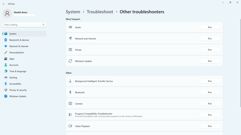 Για να είσαι συγκεκριμένος, αυτόέχει 10 διαφορετικούς αντιμετώπους προβλημάτων, όπως ήχος, δίκτυο και διαδίκτυο, εκτυπωτής, ενημερώσεις των Windows, υπηρεσία ευφυής μεταφορά φόντου, Bluetooth, κάμερα, αναπαραγωγή βίντεο και Windows Media Player. Μπορείτε να χρησιμοποιήσετε αυτούς τους αναφερόμενους προβλημάτωνΑναζήτηση και επίλυση προβλημάτων με τα ενσωματωμένα εξαρτήματα των Windows 11 PC.