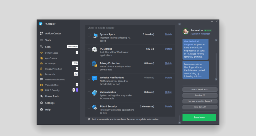Finder Funnabilities:Το εργαλείο επισκευής που επιλέγετε για τον υπολογιστή σας θα πρέπει επίσης να έχει έναν εντοπιστή ευπάθειας για να βρείτε προβλήματα με τους αποθηκευμένους κωδικούς πρόσβασης, τις ρυθμίσεις ασφαλείας, τις εφαρμογές, τους ιστότοπους κ.λπ.