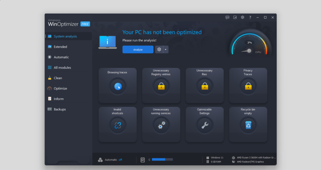 Όταν ανοίγετε το Ashampoo Winoptimizer δωρεάν στον υπολογιστή σας, αυτόδείχνει την κατάσταση βελτιστοποίησης του υπολογιστή. Εάν λέει ότι ο υπολογιστής δεν είναι βελτιστοποιημένος, μπορείτε να εκτελέσετε την ανάλυση, να διορθώσετε σχεδόν τα πάντα λάθος με αυτό και να το βελτιστοποιήσετε για καλύτερη και ομαλότερη απόδοση.