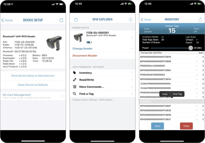 Ο RFID Explorer θα σας παρέχει γρήγορα τη λίστα των ετικετών κοντά. Η εφαρμογή λειτουργεί καλά με τον αναγνώστη 1128 Bluetooth UHF. Μπορείτε να δημιουργήσετε και να δημιουργήσετε ετικέτες με τη βοήθεια αυτής της εφαρμογής. Μπορείτε επίσης να προσαρμόσετε ετικέτες στην τράπεζα μνήμης της εφαρμογής.