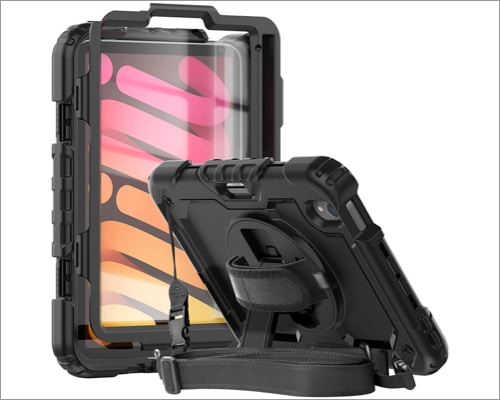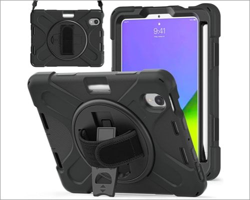 Η θήκη Zenrich iPad Mini 6 είναι πολυεπίπεδη, κομψή και έρχεται σε διαφορετικά χρώματα. Έχει μια περιστρεφόμενη βάση πίσω, ένα ιμάντα χεριών και ένα μακρύτερο ιμάντα ώμου. Υπάρχει επίσης ένας κάτοχος μολυβιού στην άκρη της μιας πλευράς.