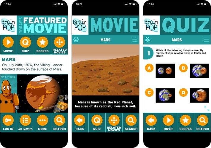 Πακετάρετε γνώσεις στο περιτύλιγμα της ψυχαγωγίας. Το Brainpop έχει ένα ρεπερτόριο κινούμενων ταινιών για να ασχοληθεί με όμορφες αφηγήσεις, χιούμορ και χαρακτήρα. Η εφαρμογή δημιουργεί γρήγορη σύνδεση με τα παιδιά σας σε μια φωνή που μπορούν να αφορούν τα παιδιά σας. Επιπλέον, η εφαρμογή ενθαρρύνει τα παιδιά σας να μάθουν από τον εαυτό τους στον κόσμο γύρω και στον κόσμο μέσα.