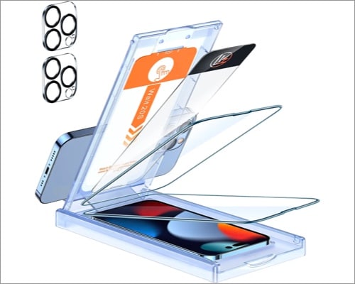 Αυτό το προστατευτικό γυαλιού έρχεται με 9Η+ σκληρότητα, είναι πιστοποιημένη από στρατιωτική ποιότητα και έρχεται με αντίσταση σε σοκ. Αυτή η προφυλακτήρα οθόνης έχει επίσης μια ελαιόφωνο επίστρωση, οπότε δεν χρειάζεται να ανησυχείτε για μουντζούρες. Ένα πράγμα που άρεσε για αυτό το προϊόν είναι ότι το πλαίσιο τοποθέτησης μπορεί επίσης να λειτουργήσει ως κάτοχος κινητού τηλεφώνου.