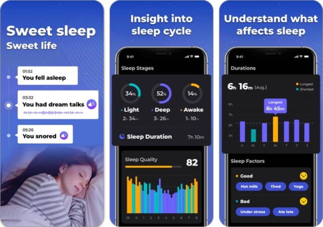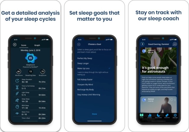 Η εφαρμογή έχει πολλά χαρακτηριστικά, αλλά πάνω από άλλους, μπορεί να υπερηφανεύεται για τους πολλούς υπνωτικούς ήχους της και την αποτελεσματική λειτουργικότητα που καταγράφει τον ύπνο, την οποία θα πρέπει να δημιουργήσετε κατά την επιλογή ενός στόχου ύπνου. Μπορείτε να αξιολογήσετε στατιστικά στοιχεία όπως η διαταραχή του ύπνου, το ροχαλητό, ο ρυθμός ύπνου, η απόδοση του ύπνου και η κόπωση στον λεπτομερή πίνακα ελέγχου.