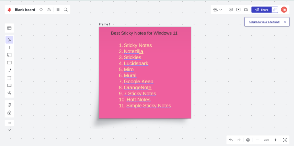 Για παράδειγμα, σας επιτρέπει να μοιραστείτε τον πίνακα με άλλους χρήστες μέσω ενός συνδέσμου. Μπορείτε επίσης να τους αφήσετε να κάνουν αλλαγές σε αυτό. Επιπλέον, μπορούν επίσηςαφήστε τα σχόλια που δείχνουν ένα κείμενο ή ένα κολλώδες σημείωμα. Συνοψίζοντας, το MIRO είναι ένα μεγάλο βοηθητικό πρόγραμμα ψηφιακού πίνακα.