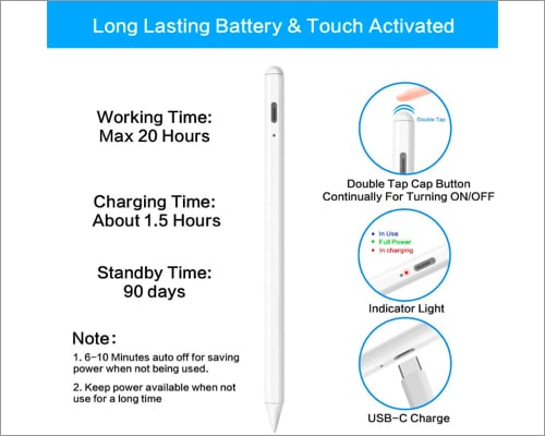 Αυτή η γραφίδα έρχεται με μια χωρητική συμβουλή backend για κύλιση, ενώ το άλλο άκρο έχει μια συμβουλή υψηλής ποιότητας για γραφή ή σκίτσο. Επιπλέον, διαθέτει χαρακτηριστικά όπως η απόρριψη της παλάμης και η αναγνώριση κλίσης. Συνδυάζει εύκολα με τα νεότερα μοντέλα iPad, ειδικά εκείνα που κυκλοφόρησαν το 2018 ή αργότερα. Ο κατασκευαστής ισχυρίστηκε επίσης ότι διαρκεί έως και 8 ώρες με συνεχή χρήση.