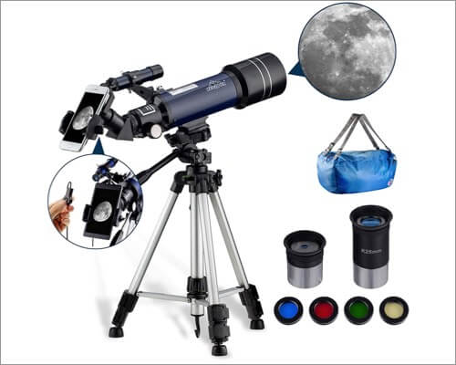 Αυτό το ταξιδιωτικό τηλεσκόπιο έχει εστιακό μήκος 400mm (F/5.7) και διάφραγμα 70mm με πλήρως επικαλυμμένο οπτικό γυάλινο φακό που ενισχύει τη φωτεινότητα των ουράνιων αντικειμένων. Η μετάδοση φωτός 98% βοηθά στην προστασία των ματιών σας. Έρχεται με δύο αντικαταστάσιμα προσοφθάλματα που προσφέρουν την ιδανική δύναμη για το φεγγάρι που παρακολουθεί στα 16x και 67x.