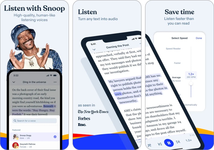 Το Speechify είναι μια εξαιρετική εφαρμογή κειμένου σε ομιλία που σας επιτρέπει να ακούσετε διάφορους τύπους περιεχομένου, συμπεριλαμβανομένων εγγράφων, άρθρων, PDFs, ηλεκτρονικού ταχυδρομείου και πολλά άλλα. Έχει πάνω από 20 εκατομμύρια χρήστες και είναι η υψηλότερη βαθμολογία App TTS στο App Store.