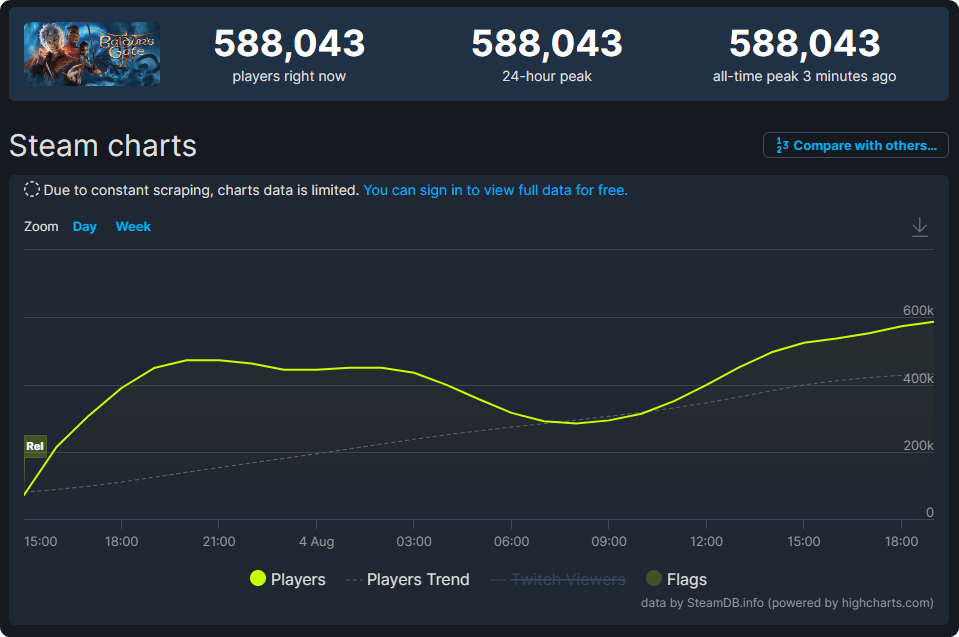 Ακόμα, η επιτυχία του BG3 είναι αξιοσημείωτη δεδομένου ότι έχει κυκλοφορήσει αποκλειστικά στην πλατφόρμα PC και λαμβάνουμε μόνο δεδομένα Steam Player Count.