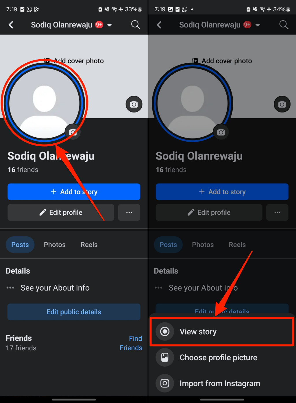 - Ανοίξτε τη σελίδα του προφίλ σας στο Facebook, πατήστε τη δική σαςφωτογραφία προφίλ, και επιλέξτεΠροβολή ιστορίας.