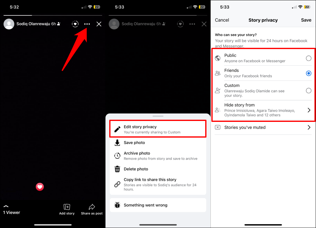 - Ανοίξτε την ιστορία σας, πατήστε τοεικονίδιο μενού τριών σημείωνστην επάνω δεξιά γωνία και επιλέξτεΕπεξεργασία της ιδιωτικής ζωής της ιστορίας