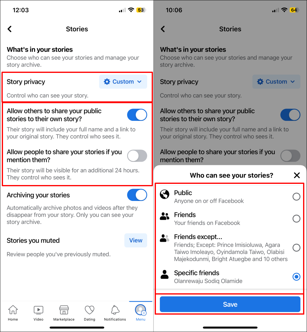 Η αλλαγή της ιδιωτικής ζωής της ιστορίας σας ακολουθεί παρόμοια βήματα στην εφαρμογή Facebook για το Android και το iOS. Μπορείτε να αλλάξετε την επιλογή απορρήτου της ιστορίας σας από μια ενεργή ιστορία ή στο μενού Ρυθμίσεις εφαρμογών.