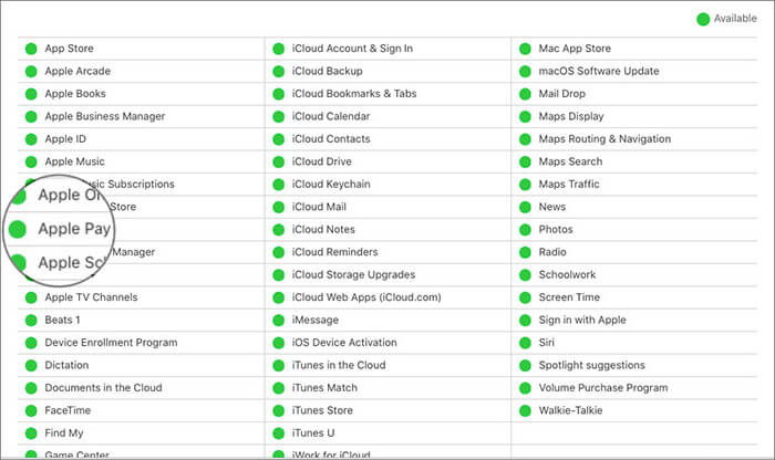 Εάν η Apple Pay είναι κάτω από την πλευρά του διακομιστή, δεν υπάρχει τίποτα που μπορείτε να κάνετε εκτός από το να περιμένετε να λειτουργούν οι διακομιστές. Δείτε πώς μπορείτε να ελέγξετε την κατάσταση των υπηρεσιών της Apple και της Apple Pay ειδικά σε αυτό το πλαίσιο: