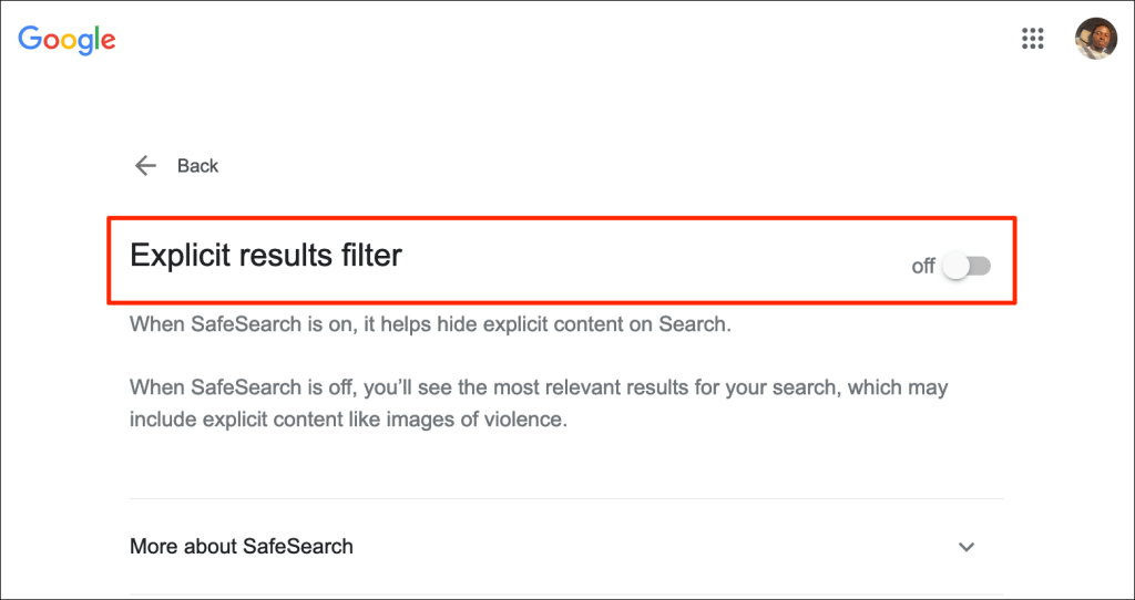 Κατευθυνθείτε προς τοΣελίδα Ρυθμίσεις Google Safesearchκαι απενεργοποιήστε το διακόπτη εναλλαγής δίπλα στοΦίλτρο ρητών αποτελεσμάτων.