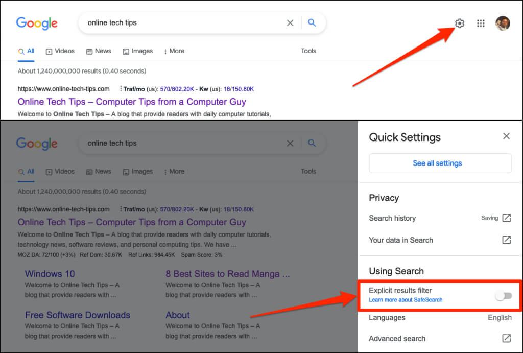 Υπάρχει ένας άλλος τρόπος για να απενεργοποιήσετε το Google Safesearch. Επιλέξτε τοεικονίδιο γρανάζιΣτην επάνω δεξιά γωνία μιας σελίδας αποτελεσμάτων αναζήτησης Google και ενεργοποιήστεΦίλτρο ρητών αποτελεσμάτων.