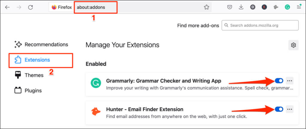 - Απενεργοποιήστε τα πρόσθετα στη σελίδα επεκτάσεων απενεργοποιώντας την εναλλαγή.